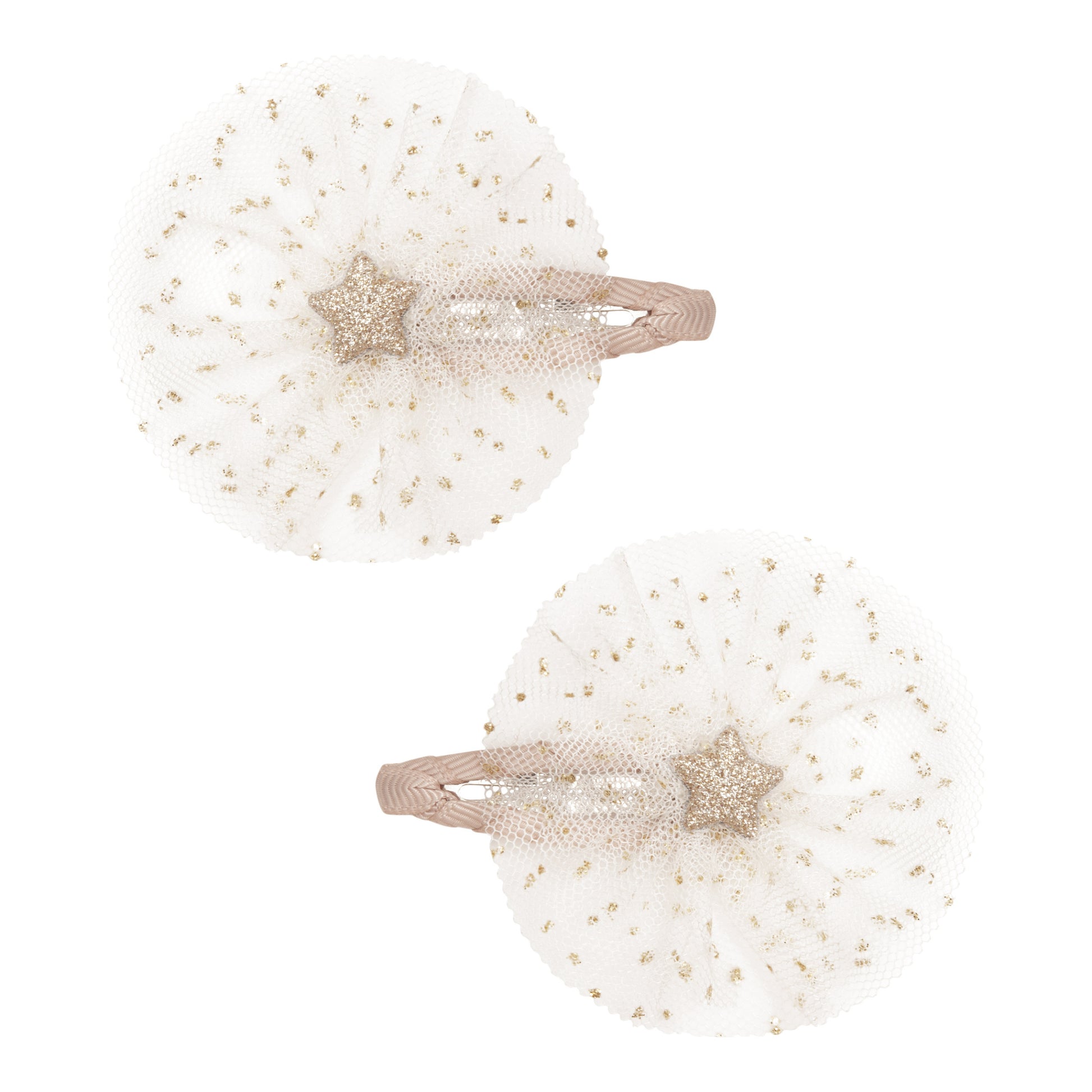 Das perfekte Haarklammern-Set für kleine Primaballerinas! Mit zarten Lagen aus goldgesprenkeltem Tüll halten diese Klammern jede Frisur im Takt!