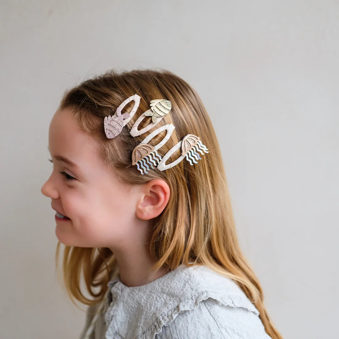 Dieses süße kleine Clip-Set enthält zwei schimmernde Quallen und zwei glitzernde, gestreifte Fische – alles in zarten Rosa- und funkelnden Tönen. Eine flossen-tastische Art, jedem Look einen Hauch von Ozean-Charme zu verleihen!