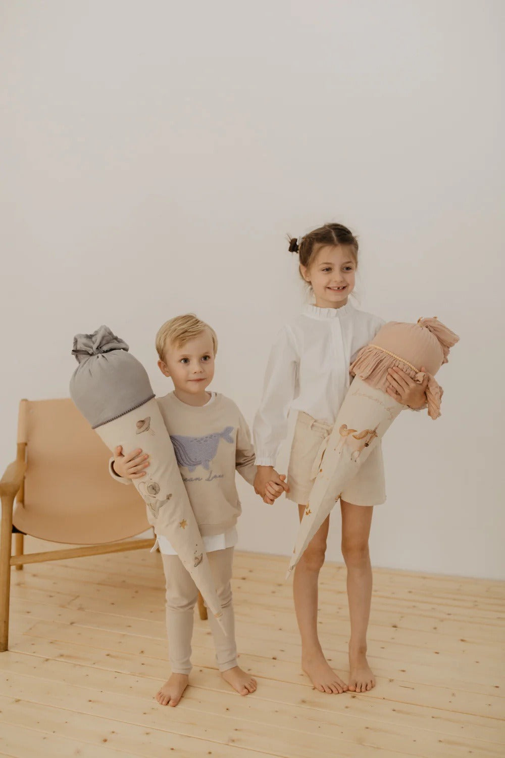 Endlich ist sie da - die erste Schultüte von leevje! Die Schultüte 'Universe' ist mit wundervollen Illustrationen aus der Astronauten-Welt versehen. Die Schultüte kommt mit einem Pappkegel und einem Füllkissen bei Dir an. Durch das Kissen ist die Schultüte langfristig als Kuschelkissen nutzbar.